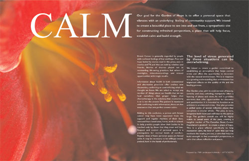 The team's intention is that the Garden will become a landmark place dedicated to women, their families and friends. It is the first project of its kind in Canada and is a new way to focus attention on breast cancer, its treatment, its underlaying causes and the intensity of the experience of being touched by its presence. Little exists in isolation and answers to health, being healthy, staying healthy and regaining health need to be explored and supported within a wide ranging context. The idea of creating a garden for a health condition and involving landscape architects, an artist, the community, the city and health professionals points to a way of thinking about the disease. The hope is to create a place that will help calm, focus and contribute toward a healing process.