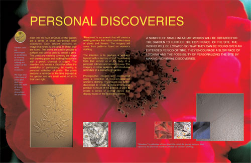 We anticipate that the garden will give to its occupants in a variety of ways. A number of inlaid artworks will be created for the garden so that a process of finding, of making accidental discoveries over an extended period of time, layer the experience of the site. They encourage a slow pace of looking and the possibility of personalizing the site by making individual discoveries. Visitors will be able to take away with them moments of place through rubbings of bronze etchings or built elements that are artworks in their own right.